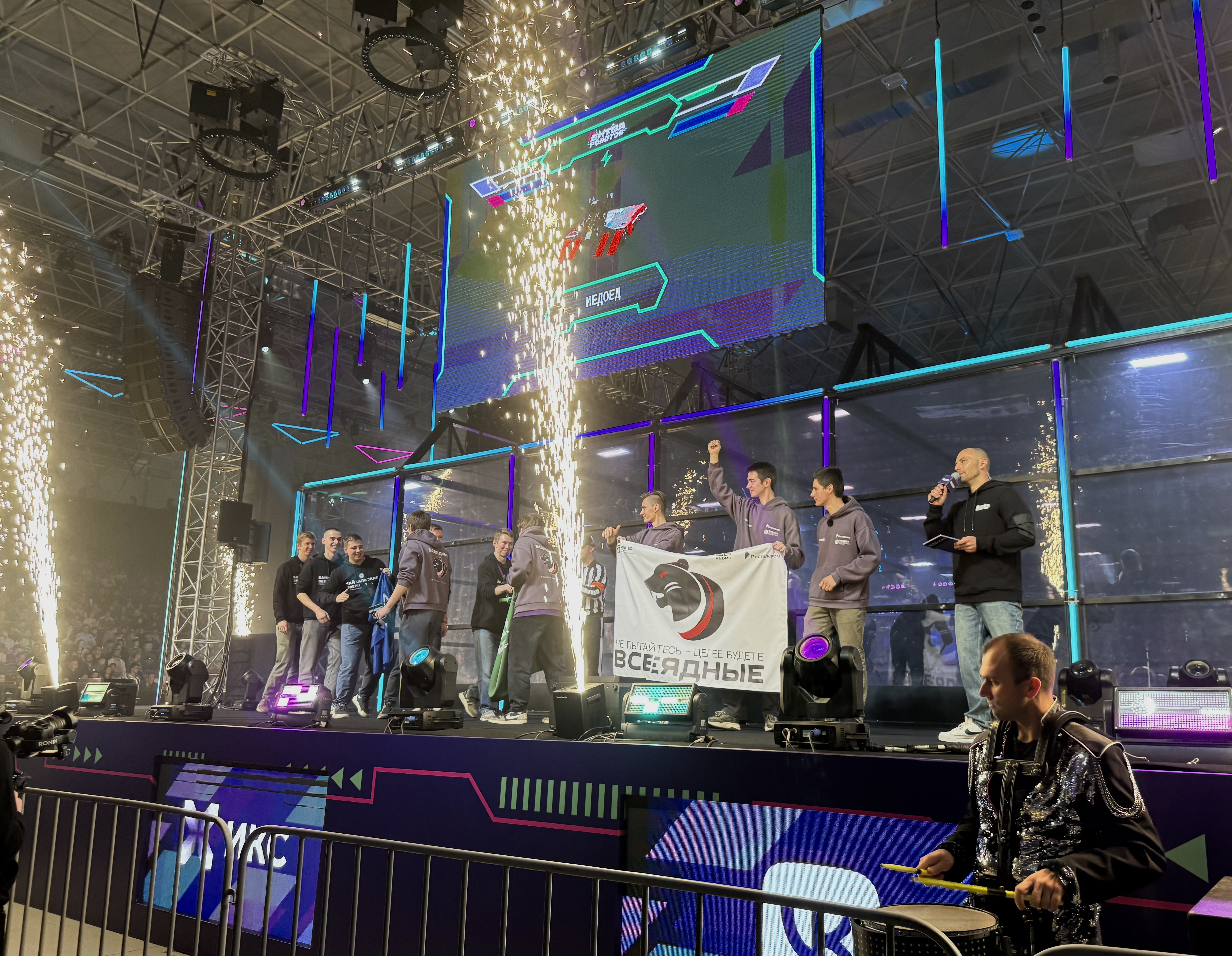 В прошлом сезоне «Всеядные» стали бронзовыми призерами, а в этом году были настроены исключительно на победу. Их обновленный робот «Медоед» действовал молниеносно: в первом раунде команда одержала чистую победу над «Байкальскими зверями», обездвижив соперника в первые секунды боя. Во втором раунде петербургским инженерам противостояла команда «Атом», которую поддерживает Basis, дочерняя компания «Ростелекома». В напряженном противостоянии сильнее оказались «Всеядные».