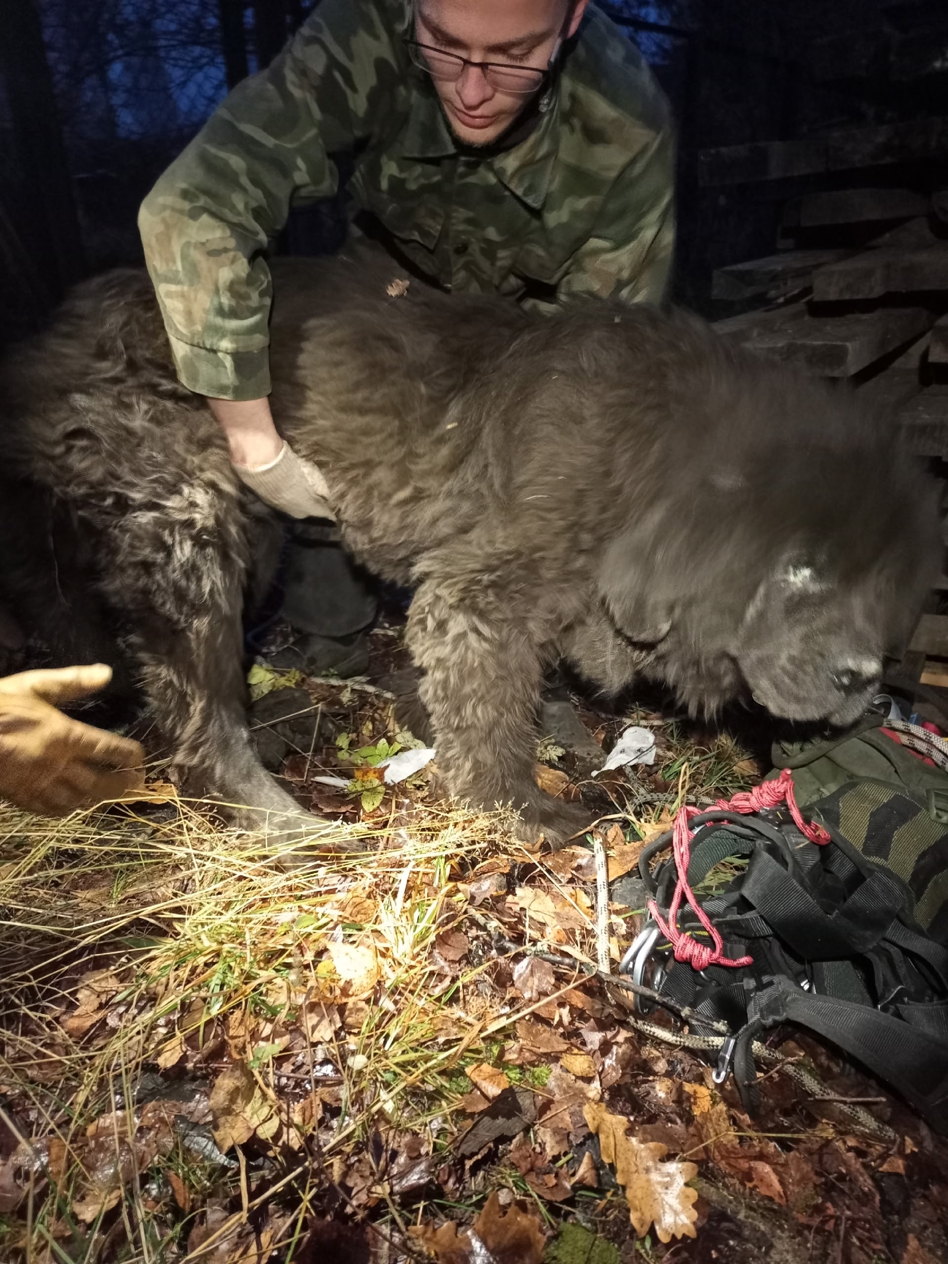 «Обычно мы достаем собак из таких мест просто набросив петельку на голову и дальше тащим. Здесь же пёс лежал и не двигался, накинуть петлю решительно невозможно, да и поднимать такую махину за шею – не вариант, потому было решено спускаться к этому добродушному великану и накидывать петлю под передними лапами вручную.