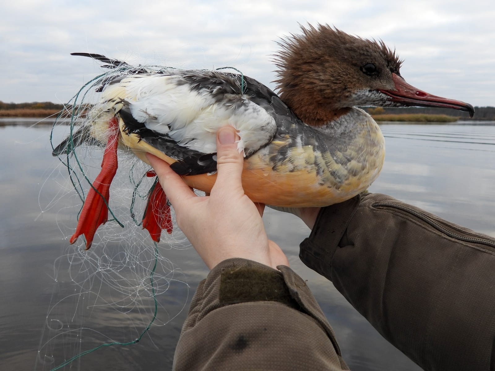 На фото большой крохаль, спасённый из рыболовной сети