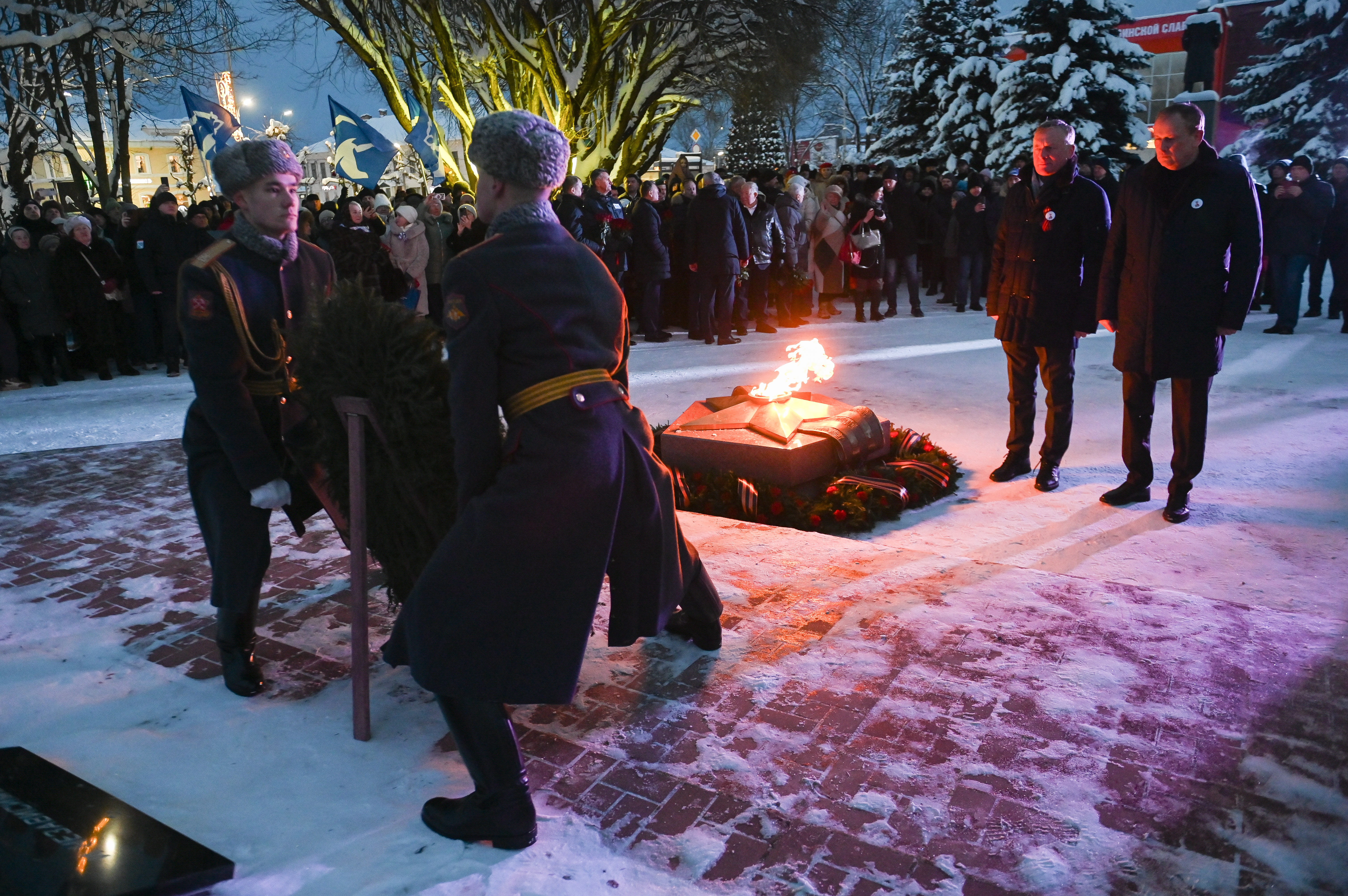 Участники церемонии возложили цветы к памятнику, почтив минутой молчания героев, которые освобождали город от немецких фашистов в годы Великой Отечественной войны.